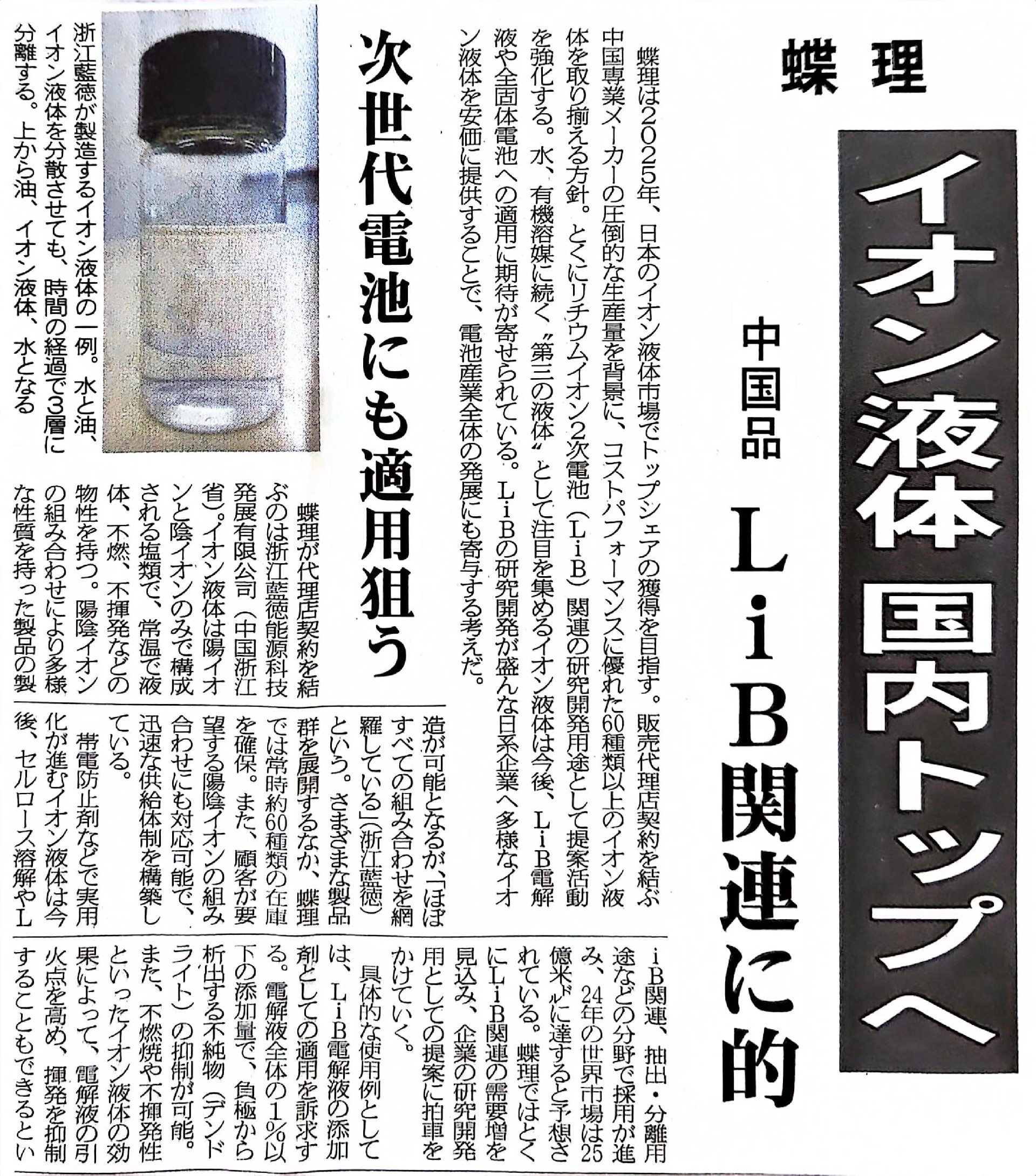 I dtionscal ceimiceach na Seapáine gach lá ar 10 Iúil, 2023, tharraing an t -ábhar ábhartha de chuid Zhejiang LDET Energy Technology Development Co, Ltd. (dá ngairtear "Teicneolaíocht LDET" anseo feasta) aird fhorleathan. Sonraítear sa tuarascáil seo dar teideal "Leachtanna Iónach a chur i bhfeidhm i leictrilítí ceallraí fuinnimh nua" na torthaí taighde tábhachtacha a bhaineann le teicneolaíocht LDET i réimse na teicneolaíochta fuinnimh nua.