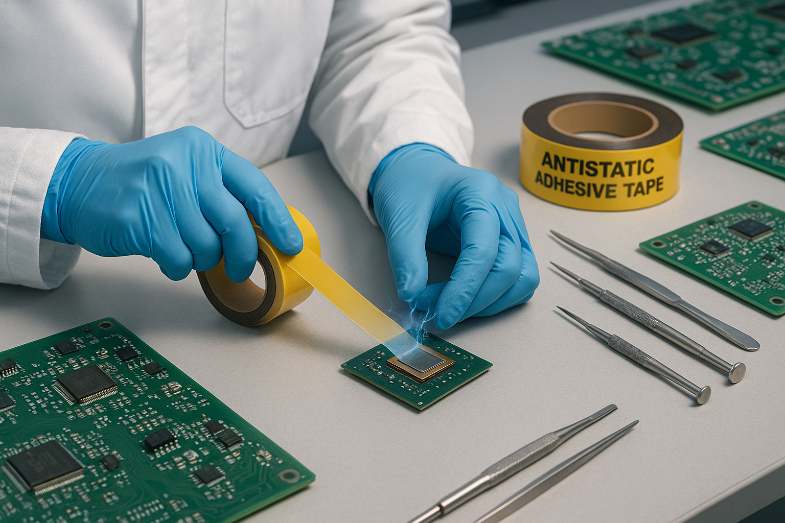 Tá cóimeáil bord ciorcad priontáilte (PCB) agus láimhseáil comhpháirteanna leathsheoltóra i measc na gcásanna úsáide is airde tosaíochta le haghaidh téipeanna fhrithstatacha. In oibríochtaí piocadh agus áit, is féidir le friothálacha téipe agus téipeanna iompróra a charnann muirear míchothú nó ábhar salaithe a mhealladh; i dtimpeallachtaí reflow agus tonn-solder, is féidir le cáithníní luchtaithe a bheith ina chúis le lochtanna sádrála. Trí úsáid a bhaint as téipeanna le friotachas dromchla rialaithe, cabhraíonn sé seo le fuinneoga próisis atá sábháilte do ESD a choinneáil agus laghdaítear teipeanna cóimeála de bharr teagmhais leictreastatacha.